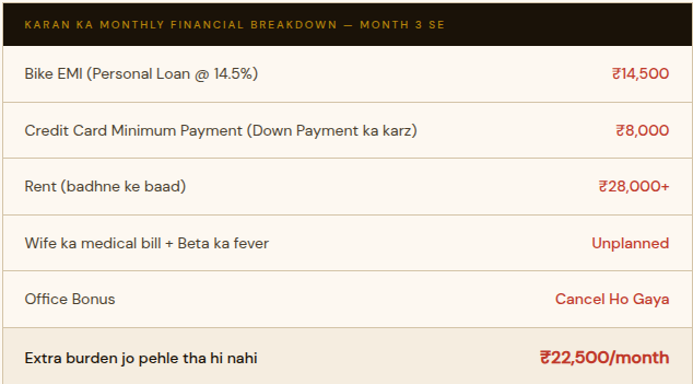 Aur sabse bura? Har baar bike dekhta hoon toh khushi nahi aati. Guilt aati hai. Woh matte-black beauty jo kabhi sapna thi — ab woh ek ₹6.5 lakh ka monthly reminder hai meri apni impatience ka.